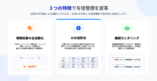 ・特徴: AI与信評点、発注・受注別与信限度額、財務3期推移、ネガティブ情報照会